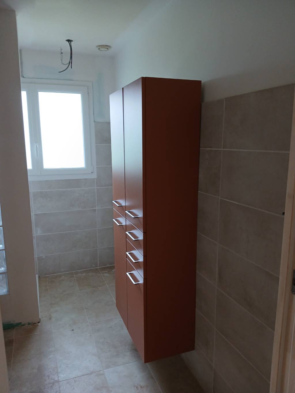 Rénovation complète d'une salle de bain avec mise en place d'un receveur en place d'une baignoire, mise en place d'un WC suspendu, d'un meuble lavabo mixte PMR et de colonne de rangement.